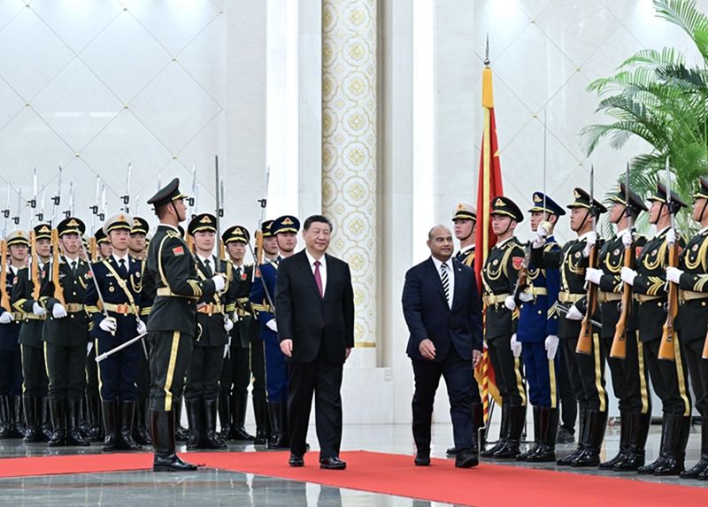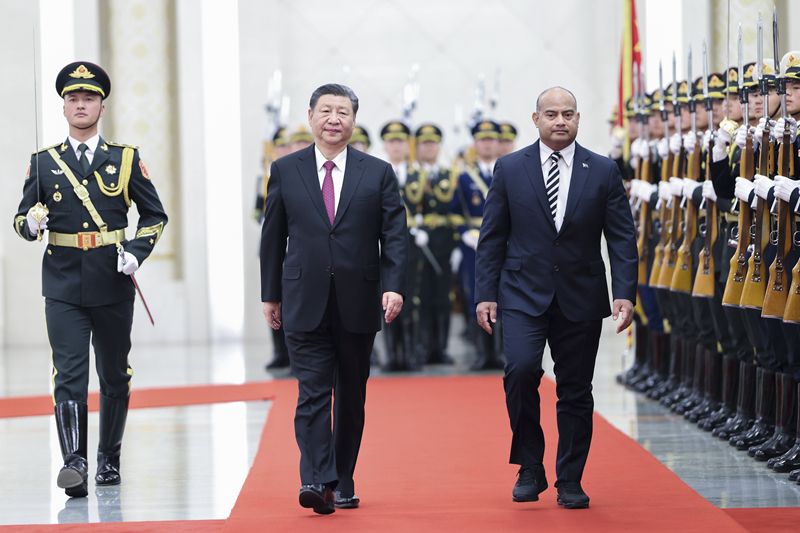 3月25日下午,国家主席习近平在北京人民大会堂同来华进行国事访问的瑙鲁总统阿迪昂举行会谈。这是会谈前,习近平在人民大会堂北大厅为阿迪昂举行欢迎仪式。新华社记者 翟健岚 摄